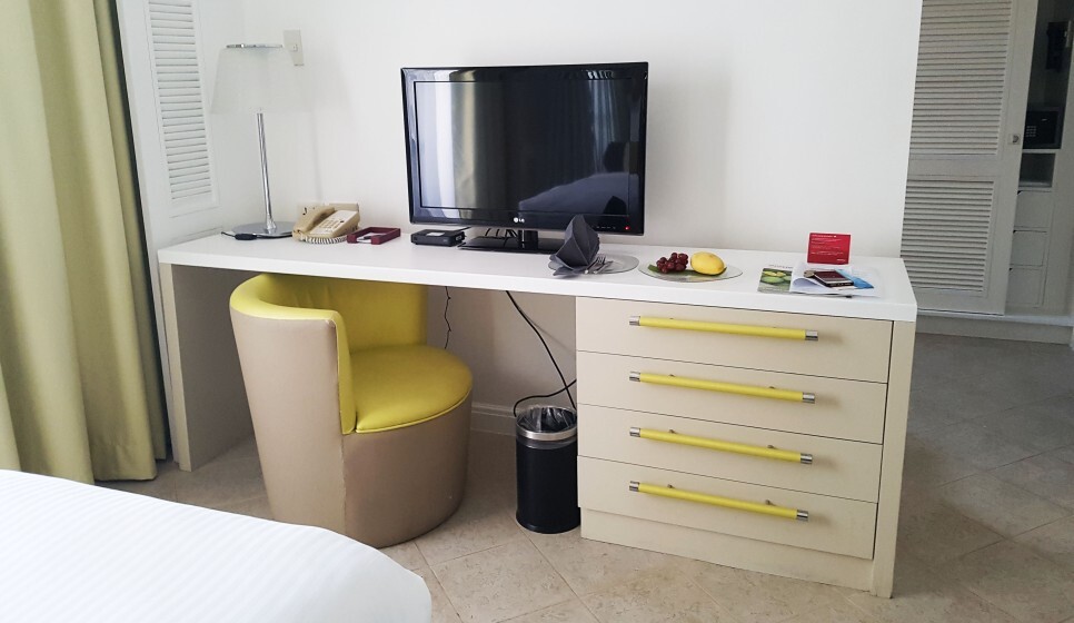 TV 있지만 필리핀 방송이라 킨 적은 없고, 조명/전화기/메모지/과일 있어요.